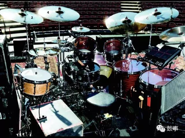 1.主军鼓:Remo Black max(上),Hazy Ambassador(下)2.副军鼓:Coated Controlled sound white dot(上),Hazy Ambassador(下)3.嗵鼓:Clear Emperor(上),Clear Ambassador(下)4.底鼓:Power Stroke3 Black dot(上),Fiberskyn front(下)