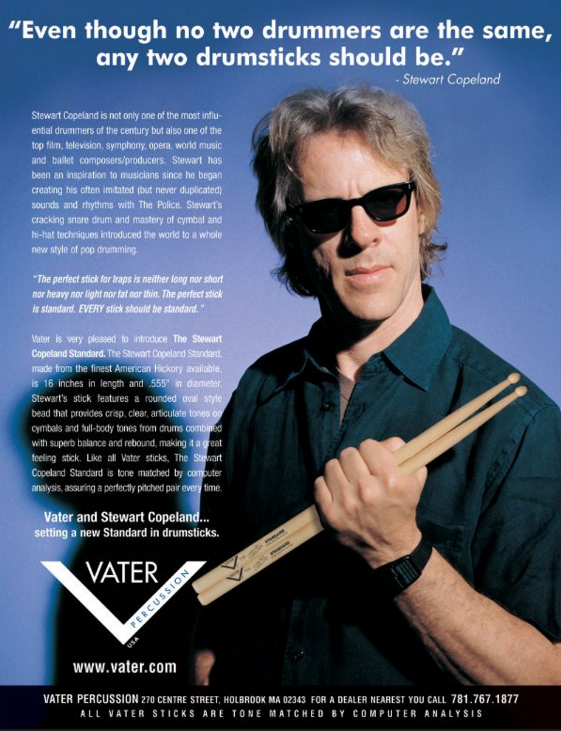 Stewart Copeland于2000年元月正式成为了Vater鼓棒艺术家。我们很快就开始制作StewartCopeland Standard鼓棒。短短数周后,我们在NAMM展的Vater展位上展出了这款鼓棒最终设计样式的无标签版本。